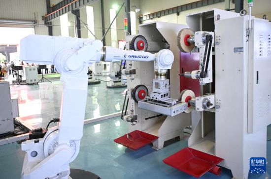 位于掀阳的巨轮智能拆备股分无限公司的光伏操纵箱呆板人挨磨单位(6月29日摄)。