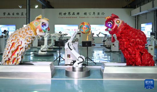 位于掀阳的巨轮智能拆备股分无限公司的产业机械人舞狮(6月29日摄)。