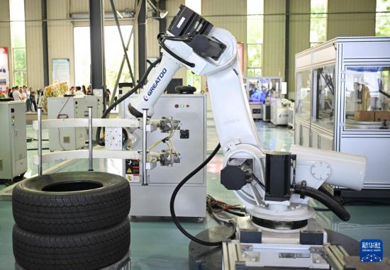 位于掀阳的巨轮智能拆备股分无限公司的轮胎柔性主动搬运机械人(6月29日摄)。