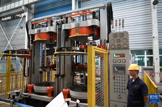 位于掀阳的巨轮智能拆备股分无限公司的液压式轮胎硫化机(6月29日摄)。