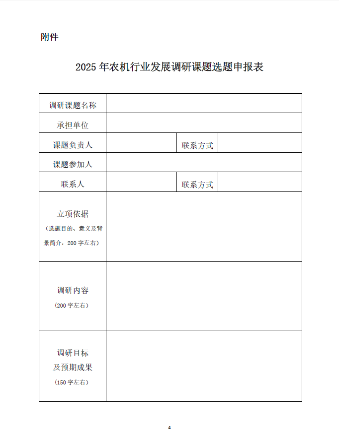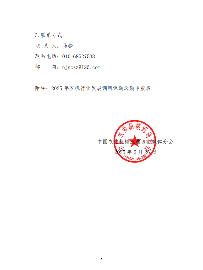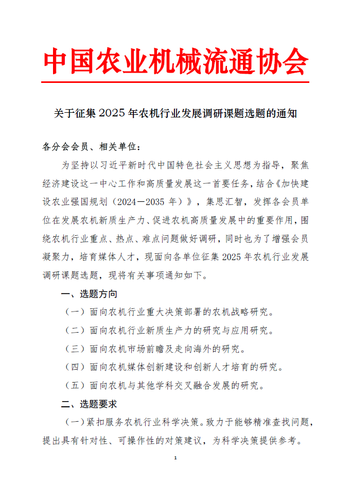为散念汇智,发扬各会员单元正在成长农机新量消费力、增进农机下量量成长中的紧张感化,盘绕农机止业中心、热门、易面题目干佳调研,共时也为了加强会员凝结力,培养媒介人材,华夏农业机器流行协会现里背各单元搜集2025年农机止业成长调研问题选题。正式文献以下。